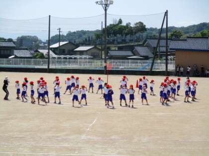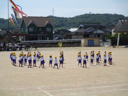 リズムにのって元気よくおどっています。曲が止まったら、玉を投げ入れます。