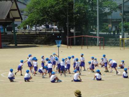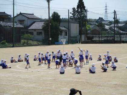 かごをめがけて、全力で投げています。 すわって応援する姿も立派です。