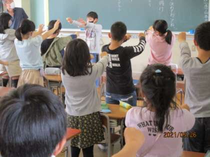 8時15分から朝の健康観察が始まります。その後、クラスによってお知らせを伝えたり、歌を歌ったり、ちょっとした体操をしたりしている様子が見られます。8時25分までのわずか10分間ですが、上手に時間をつかって朝の活動をスタートさせているようです。