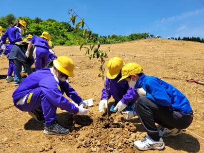 市教育委員会の方から植樹の趣旨説明を受け、班ごとにヤマザクラ、コナラ、ミズナラの木を植えました。子供たちは、大きく成長してねと声をかけています。