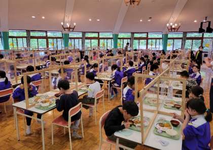 夕食の様子です。しっかり感染予防の対策がなされていて、子供たちも静かに食事をしています。おかわりをする元気な子供たちもいます。
