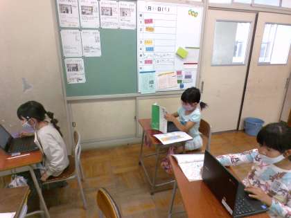 国語科「スイミー」を初めて音読しました。クロムブックの音声入力機能を使って、自分の読み方を確認をしながら音読しています。