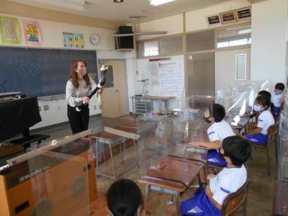 リコーダー講習会で、息の入れ方や指遣いを教えていただきました。いろいろな大きさのリコーダーを見たり音をきいたりすることも楽しみました。