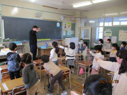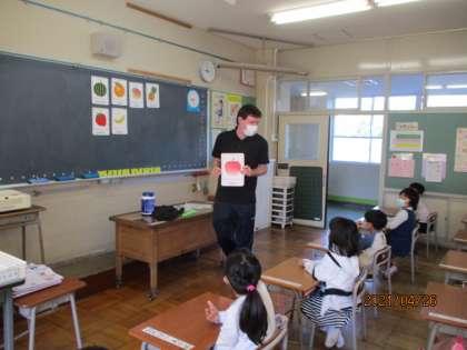 1年生になって2回目の外国語活動です。子供たちは、ALTの先生と色の言い方を楽しく学習しました。