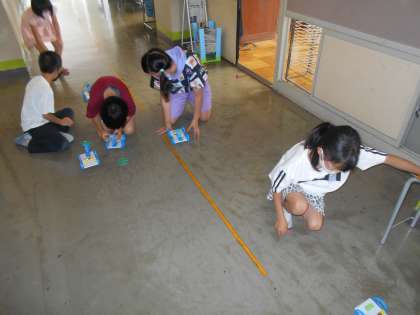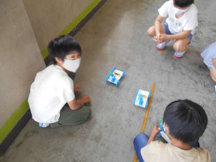 理科では、実験セットを作り、車を走らせました。子供たちは、「回路ができたから流れたね」「逆に進んだな。どうしてだろう」とつぶやきながら実験を行っていました。次回は、検流計を使って、モーターの回る向きは、電池の向きと関係があるのか調べる予定です。