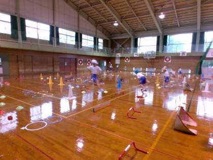 体育科の学習で団ごとに工夫したコースを作り、みんなで障害物リレーを体験しました。友達の作ったコースの面白さを感じたり、自分の気に入ったコースを選んで走って楽しんだりしました。