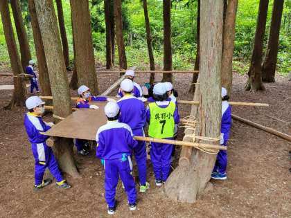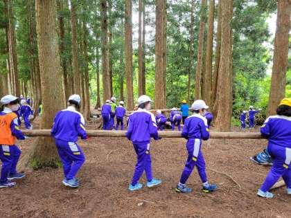 森の中で、遊び場づくりを始めています。太い丸太を協力して運び、縄でしっかり縛っています。