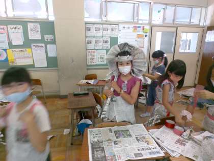 しんぶん紙をつかって何ができるか考えたよ! 公開日 2021/06/17 更新日 2021/06/17 2年生の活動 図画工作科「しんぶんしとなかよし」では、新聞紙を丸めたり、広げたりしながら、傘やエプロンを作りました。子供たちは新聞紙の感触を楽しみながら活動に取り組みました。