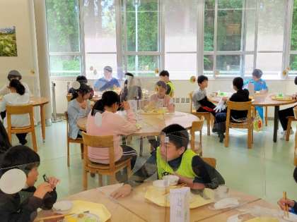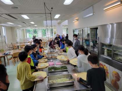 おはようございます。さわやかな朝を迎えました。食堂では、バイキング形式の朝食中です。しっかりビニール手袋をつけて配膳やお代わりを行っています。