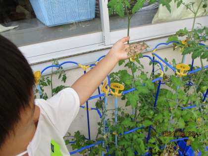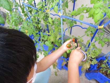2年生の子供たちは、毎日自分たちが育てている野菜の世話をがんばっています。成長の様子をクロムブックで撮影したり、実を収穫したりしています。赤くなったトマトをうれしそうに収穫する子。花が咲き終わり、小さな実ができてきたことを喜ぶ子。みんな笑顔で話してくれました。