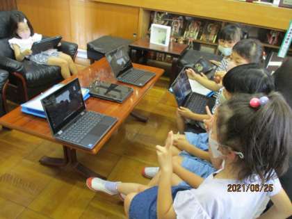 今日もたくさんの1年生が校長室を訪れました。1番関心が高いのは、ずらっと並んだトロフィーです。ソファに座るのを楽しみにしている子もいました。タイマー機能を使い、自撮りで記念撮影する子供たちもいて、みんなのわくわく感が伝わってきました。クロムブックを活用している様子がよく分かります。