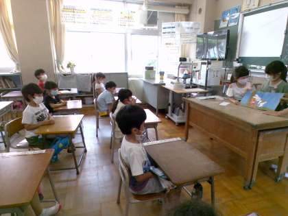 学級活動の時間に、読み聞かせ係による絵本の読み聞かせがありました。友達に読んでもらうことは初めての子が多く、どの子も真剣に聞いて、絵本の世界を楽しんでいました。