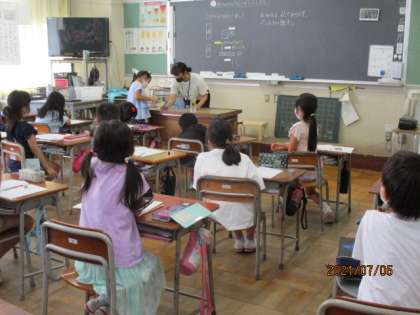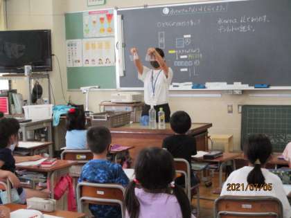 1デシリットルの量感をつかむため、実際に測ってみています。かさの単位を正確に書けるかな。