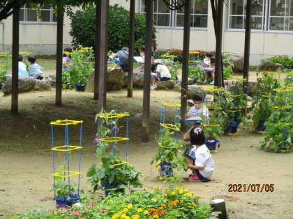 今朝の強い雨風で、中庭のあさがおの鉢がたくさん倒れてしまいました。あさがおは元気かな、つるはどんなふうにのびているかな、花が咲いた後はどうなるのかな、観察中です。