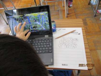 クロムブックで撮影した写真を拡大して見ながら、気になったつるの様子をカードに書いている子もいます。