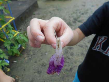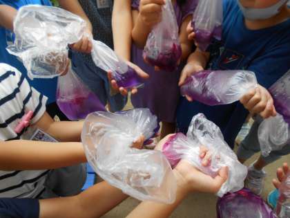 今週は、アサガオの花で色水作りを行っています。落ちた花を観察してから、水や花の量を調整して、自分好みの色水作りを楽しんでいます。
