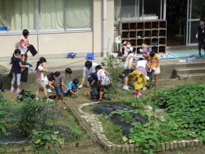 2年生の野菜畑も夏休みの間に、野菜ともに雑草もすくすく成長していました。みんなで協力して草むしりをがんばっていました。すっきりしましたね。