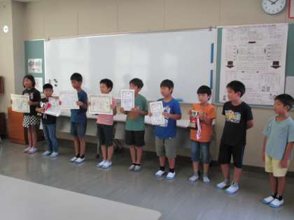 夏休み中に、様々な大会や作品応募にチャレンジし、受賞した子供たちを全校に紹介しました。クロムブックを活用して録画したものをクラスルームにアップして見てもらう形です。
