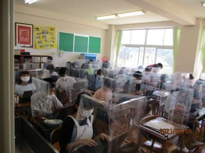 感染症予防に配慮した活動も 公開日 2021/09/09 更新日 2021/09/09 行事より 外国語活動教室は、やや狭く飛沫防止のパネルを利用しています。コミュニケーションをとる手段としてクロムブックを活用しています。スプレッドシートに入力した情報をみんなで共有しながら進めていました。