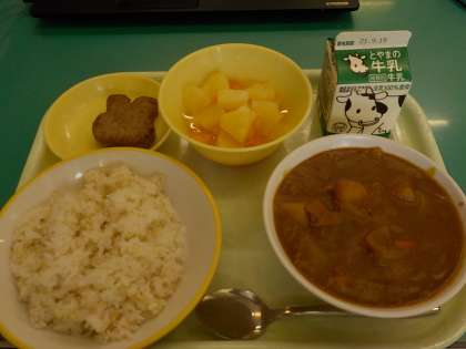 今日は、十五夜ハンバーグカレーライス、フルーツ白玉のお月見献立でした。給食室では、調理員さんが大きな回転釜でカレーを作っておられました。(写真左)カレーライス、ハンバーグ、フルーツ白玉と給食でも人気のメニューばかりで、子供たちはとてもうれしそうに食べていました。