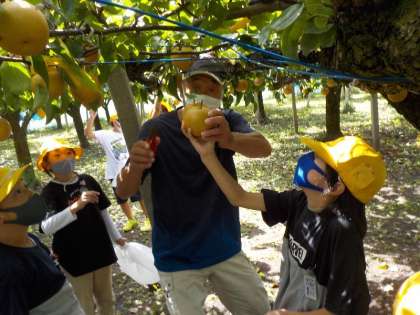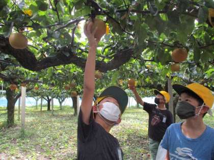 総合的な学習の時間に、呉羽梨を育てている農家の梨畑を訪問して、梨の収穫をさせていただきました。収穫の仕方やおいしい豊水の見分け方を教えていただき、大きく実った豊水を収穫することができました。