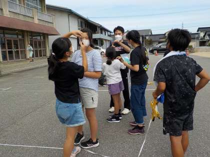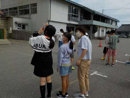 算数科「拡大図と縮図」では、呉羽小学校の校舎の高さを求める課題に取り組みました。