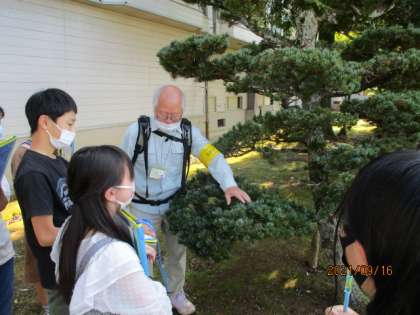 富山県フォレストリーダーの方に、校庭の木々について、名前や特徴などを教えていただいています。学校にどんな木があるのか、全校のみんなにも関心をもってもらえるようにしていきたいと思います。
