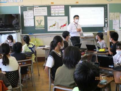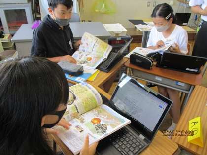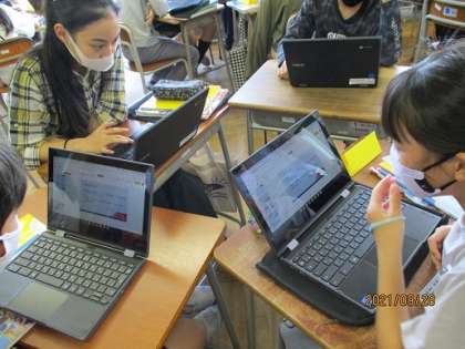 一人一台端末を使って社会科の学習を行いました。クラスの友達の調べた内容をみんなで一度に見ることができます。織田信長が天下統一したひみつにせまりました。