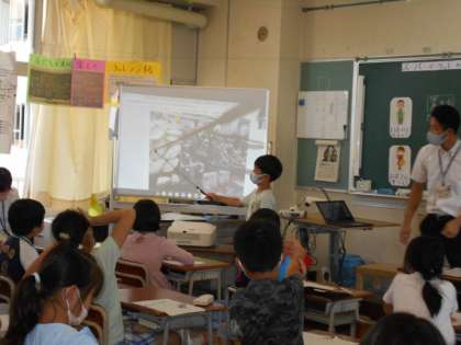 社会科では、スーパーマーケットについて学習をしています。自分が調べてきたことを一人一台端末を使ってまとめ、グループで発表しました。友達の発表を聞き、自分の考えと比べることで、スーパーマーケットの様々なひみつを見つけていました。
