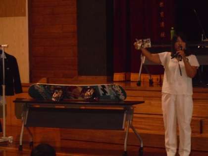 富山県出身のプロスノーボーダー広野あさみさんから、オリンピック選手になるまでや、オリンピックでの様子についてお話を聞きました。初めは目標や夢がなくても、いろんなことに何回でも挑戦していくことで夢や目標ができること、夢を叶えるために今まで自分がやってきたことに無駄なものはなかったことなど聞くことができました。