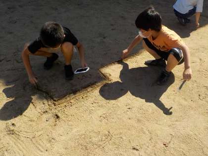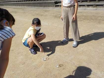 3年生は、理科の学習でグラウンドでかげを観察しました。遮光板を使って太陽と影の関係を観察したり、いろいろな物の影の形や濃さを調べたりしました。国語の「ちいちゃんのかげおくり」で学習しているかげおくりもみんなで楽しみました。