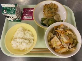 今日の給食は、ご飯、牛乳、かしわうどん、えごま入りかき揚げ、昆布和え、しそかつおふりかけ、でした。えごま入りかき揚げには、えごまの葉、かぼちゃ、ごぼう、さつまいもなどたくさんの野菜がはいっていました。えごまは、「食べると十年長生きする」と、いわれるほど身体によい食べ物です。富山市では、えごまの特産化を目指し、山田地区にある植物工場でえごまを生産しています。かしわうどんもあたたかくて、みんなおいしそうに食べていました。