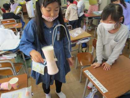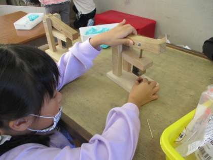 どんぐりに穴をあけてコマ作りをする子、まつぼっくりのけん玉を作る子など、それぞれに秋の自然で見付けたものをつかって楽しんでいます。