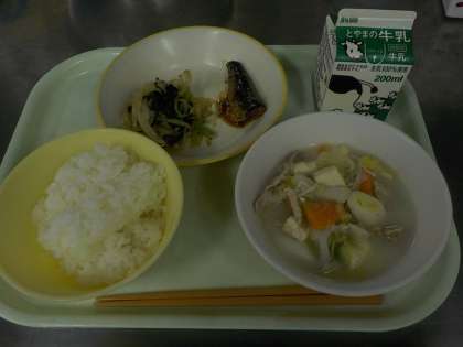 今日の献立は、ごはん、塩こうじ鍋、いわしの土佐煮、おひたし、牛乳でした。今日のような寒い日には、ぴったりの献立でした。塩こうじ鍋には、豚肉、焼き豆腐、はくさい、ねぎなどたくさんの具材が入っていました。塩こうじの甘みが感じることができ、とてもおいしかったです。残食もほとんどありませんでした。