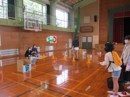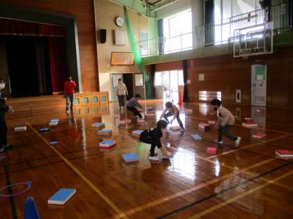 体育館では、「ひっくり返し大作戦」「パーフェクトシュート」に挑戦中。2色の箱をひっくり返したり、様々な大きさのボールをゴールに向かって投げたりして、楽しく活動しています。