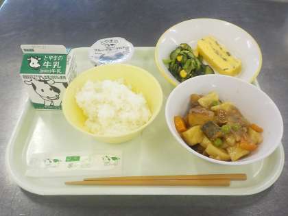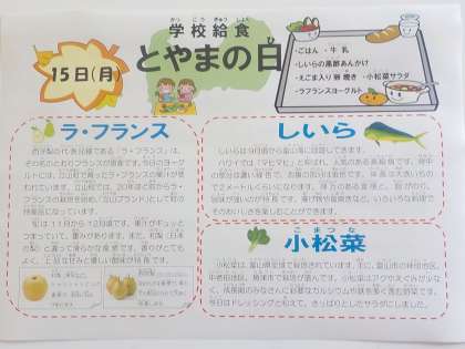 今日は、今年度2回目の学校給食とやまの日でした。献立は、ごはん、牛乳、しいらの黒酢あんかけ、えごま入り卵焼き、小松菜サラダ、ラフランスヨーグルトでした。