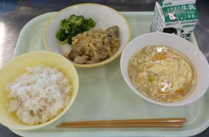 今日の献立は、麦ごはん、スタミナレバー、ゆでブロッコリー、中華かきたまスープ、牛乳でした。スタミナレバーには、鶏肉、レバー、切干し大根、たまねぎ、たけのこなどがたくさん入っていました。「レバーが苦手!」という声が聞かれましたが、「レバーが大好き!!」という声も聞かれましたよ。中華かきたまスープには、野菜がたっぷり入っていて、とてもおいしかったです。