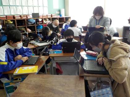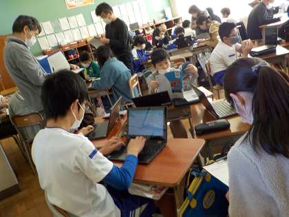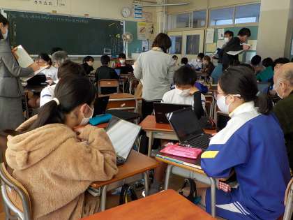 校内研修会で、6年1組社会科の授業が公開となりました。明治時代の政治にどのようなよさや課題があったのか、様々な人々の立場にたって考え、分かったことをグループで伝え合いました。一人一台端末を生かし、自分が調べたり考えたりしたことをグループで伝え合う中で、明治時代の政治について自分の考えをまとめることができました。