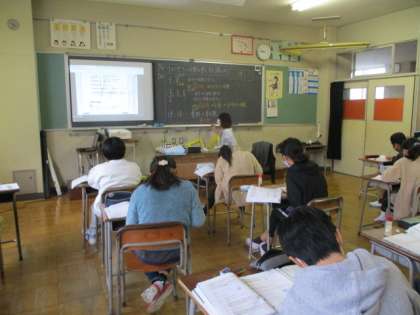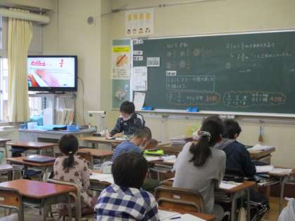 分数の学習を、少人数に分かれて行っています。みんな真剣に考え、ノートにまとめています。