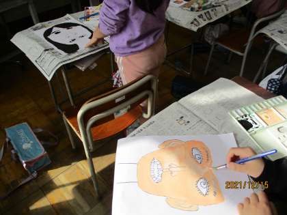 4年生は図画工作の時間に自画像を描いています。鉛筆で下書きをした後に、油性マジックでなぞり、水彩絵の具で色をつけています。クロムブックで撮影した自分の顔写真をよく観察して描いています。