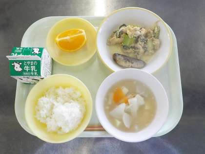 今日の献立は、ごはん、いわしの梅煮、卵とチンゲンサイの炒め物、いものこ汁、あいか、牛乳でした。いものこ汁には、里芋や大根などがたくさん入っていて、おいしかったです。デザートのあいかは、果肉が柔らかく、甘い果汁がたっぷりで、こちらもとてもおいしかったです。