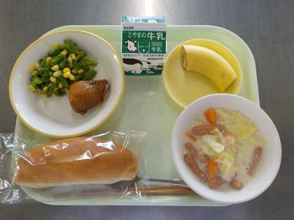 今日の献立は、米粉パン、照焼きチキン、イタリアンサラダ、春キャベツのクリームシチュー、バナナ、牛乳でした。県内産のお米の粉を混ぜて作った米粉パンは、もちもちとした食感と、ほんのり甘みがあっておいしかったです。また、春キャベツのクリームシチューは春キャベツたっぷりの優しい味付けで、子どもたちはパンに付けたり、そのままおいしそうに食べたりしていました。