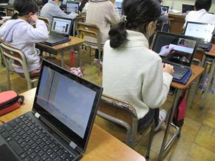「のこぎりの使い方」を事前に動画で見て、気を付ける点を各自が確認しています。