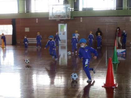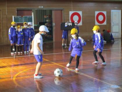2年生が体育館でボールけりに挑戦。相手のすきをついて、うまくゴールまでたどりつけるでしょうか。