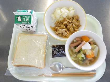 1月26日は、「ハリーポッターシリーズ」にちなんだ献立でした。メニューは、食パン、ポークチョップ、ゆでポテト、百味ビーンズのポトフ、チョコレートクリーム、牛乳でした。百味ビーンズのポトフには、色々な豆(ひよこ豆、青えんどう豆、赤えんどう豆)の他に、キャベツ、ブロッコリー、ウインナーなどが入っていて、見た目もきれいで、とてもおいしかったです。食パンには、チョコレートクリームも付いていて、子供たちも嬉しそうに食べていました。