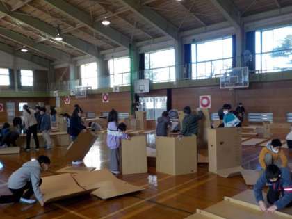 防災学習として講師の方からの災害や避難所についてのお話を聞きました。その後、避難所で活用するタンボールベッドを作ったり、床との寝心地を比べたりしました。子供たちは楽しみながら災害について学び、災害時の避難生活を理解することができました。