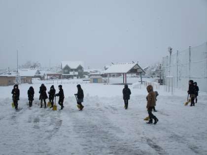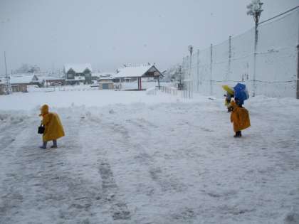 雪道に気を付けて、子供たちは元気に登校しました。高学年の子供たちも玄関前の除雪作業を手伝ってくれています。お弁当をもってきたことを嬉しそうに話してくれる1年生がたくさんいました。