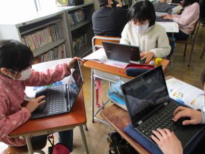 健康に過ごすための方法について考えています。自分の食生活をチェックする場では、給食のメニューをもとに、主菜・副菜について友達と分担しながら調べ、バランスのとれた食事について考えています。