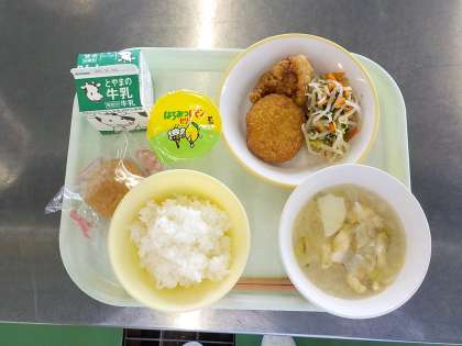 今日は、選択献立の日でした。主菜は、豚肉の竜田揚げ、えびカツ、デザートは、はちみつレモンゼリー、いちごのシュークリームから自分で選んだ物を食べました。他は、ごはん、ごま和え、みそ汁、牛乳の献立でした。今日は朝から、選択献立を楽しみにしている、という人がたくさんいたようです。みそ汁には、じゃがいも、玉ねぎ、うす揚げ、というお馴染みの具材が入っていて、とてもおいしかったです。