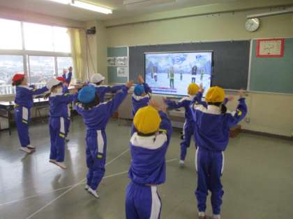 1年生 体育科 公開日 2022/02/15 更新日 2022/02/15 1年生の活動 準備運動にNHKの番組を活用して、ダンスをしています。「もう振り付け、全部覚えたよ」という声が聞こえてきました。とっても楽しそうに体を動かしています。